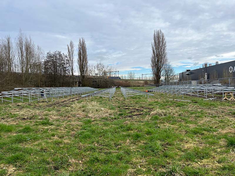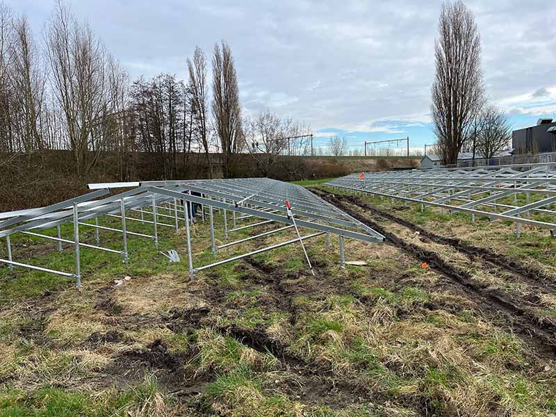 Voor deze veldopstelling in Hoofddorp hebben we in de kleigrond 110 schroefpalen geplaatst van 1,5 meter en 110 schroefpalen van 2 meter. In totaal ging het om 10 tafels, waarbij er 19 panelen per tafel komen te liggen.